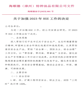 海順德(漳州)特種油品有限公司為進(jìn)一步落實(shí)企業(yè)安全生產(chǎn)主體責(zé)任,強(qiáng)化公司安全、環(huán)保、健康管理工作,開年之初便下發(fā)了公司一號(hào)文——《關(guān)于加強(qiáng)2023年HSE工作的決定》。明確公司2023年度安全目標(biāo)和環(huán)保目標(biāo)。目標(biāo)明確要求安全方面要實(shí)現(xiàn)公司全年報(bào)車間(部門)級(jí)以上事故為零,不發(fā)生被政府部門處罰的重大隱患和事件,企業(yè)主要負(fù)責(zé)人、安全管理人員安全能力考核合格率100%,特殊工種從業(yè)人員持證上崗率100%,八大特殊作業(yè)JSA分析率100%,承包商、危險(xiǎn)化學(xué)品車輛安全相關(guān)資質(zhì)合格率100%等重要目標(biāo)。環(huán)保方面要求做到不發(fā)生被政府部門處罰的環(huán)境問題和污染事件,排污許可執(zhí)行率100%,污水外送合格率100%,環(huán)境監(jiān)測(cè)計(jì)劃執(zhí)行率100%等具體指標(biāo)。